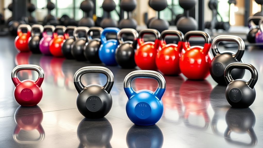 If you have multiple kettlebell sets, I recommend a sturdy, stackable storage rack. Did you know that organized spaces boost workout consistency by 25%? I find that a vertical rack saves space and keeps your weights accessible. You can also consider wall-mounted racks for small spaces or labeled bins for easy identification. Whatever you choose, guarantee it’s stable and keeps your kettlebells secure.
