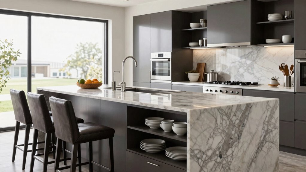 If you’re after durability and style, I recommend choosing materials like granite or quartz for your kitchen island. They’re tough enough to handle daily wear and tear while adding a sleek, modern look. But don’t overlook butcher block or stainless steel—each offers a unique charm and resilience. I’ve found that mixing textures can also elevate your space beautifully. Ready to transform your kitchen into a durable, stylish haven?