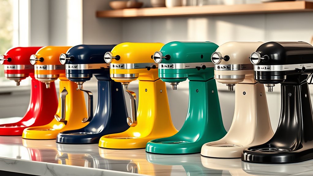 In 2025, interior designers favor bold and trendy KitchenAid mixer colors like matte black, soft blush pink, and vibrant navy blue. These shades add a modern touch and serve as statement pieces in kitchens. I find that mixing classic metallics with these trendy hues creates a balanced, stylish look. If you’re aiming for a designer-inspired aesthetic, these colors can definitely elevate your space and reflect current design trends.