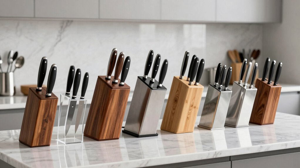 You might think a knife block set just holds blades, but it actually transforms chaos into calm in my kitchen. With designated spots for each knife, I no longer dig through drawers, risking cuts or missing tools. It’s like having a personal assistant, keeping everything accessible and organized. Honestly, it’s the simplest upgrade that makes cooking smoother, safer, and a lot more enjoyable.