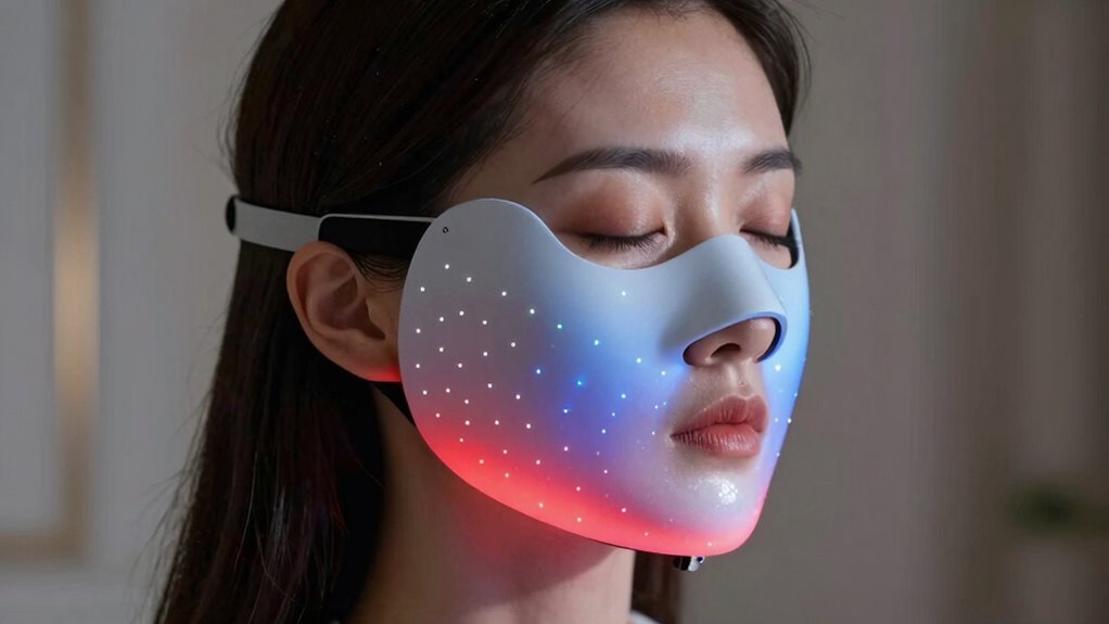 A comfortable and well-fitting LED face mask is essential because it guarantees even light coverage and maximizes treatment effectiveness. When a mask conforms to facial contours, it ensures all areas receive consistent light exposure, which is critical for reducing wrinkles. Adjustable straps and flexible materials enhance comfort, especially during longer sessions, by reducing pressure points. A snug but not tight fit prevents light from leaking, ensuring therapy remains focused and efficient. Masks made from soft, skin-friendly silicone or similar materials help minimize irritation and boost comfort, encouraging regular use. When your mask fits well and feels comfortable, you’re more likely to stick with your treatment routine, which is necessary for achieving the best wrinkle-reduction results. Comfort and fit truly make or break your skincare experience.