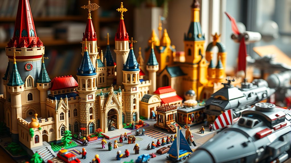 Have you thought about how well a LEGO set will fit into your available display space? It’s important to consider the set’s dimensions—whether it’s a towering model like Hogwarts Castle or a compact cityscape—so it fits comfortably on your shelf, desk, or cabinet. Larger sets, over 17 inches tall, become striking focal points but require sturdy surfaces to support their weight. Smaller sets are easier to integrate into limited spaces or intricate displays, making them versatile for various environments. Also, think about the visual impact; bigger, detailed models create a bold statement, while smaller ones can complement other decor. Evaluating size and weight beforehand helps ensure your chosen LEGO set enhances your space without causing clutter or stability issues.