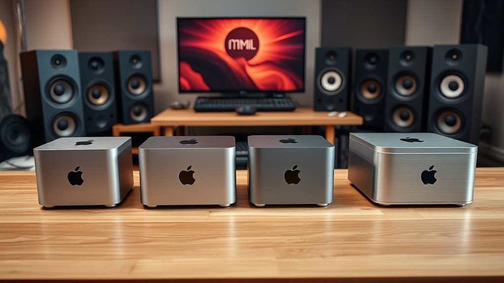 Have you considered how much storage space your home studio needs to run smoothly? Mac minis offer options ranging from 256GB to 2TB or more, affecting how much data and software you can store locally. If you work with large project files, media libraries, or extensive plugins, opting for 1TB or 2TB SSDs can be a game-changer, providing ample space without relying heavily on external drives. Upgrading to higher capacities at purchase not only streamlines your workflow but also future-proofs your setup, saving you time and hassle. For those needing even more room, external SSDs are a practical solution, especially when handling large media sets. Ultimately, your storage choice impacts cost, performance, and expandability—making it a critical factor in selecting the right Mac mini for your studio.