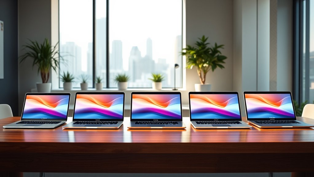 If you’re looking for the best MacBook Air models for business in 2025, I recommend focusing on options with the powerful M4 chip, up to 24GB of memory, and stunning Liquid Retina displays. The 13-inch and 15-inch models balance portability with performance, featuring long battery life and fast charging. They also offer plenty of ports and secure features like Touch ID. Keep exploring to find the perfect fit for your professional needs and workflow.