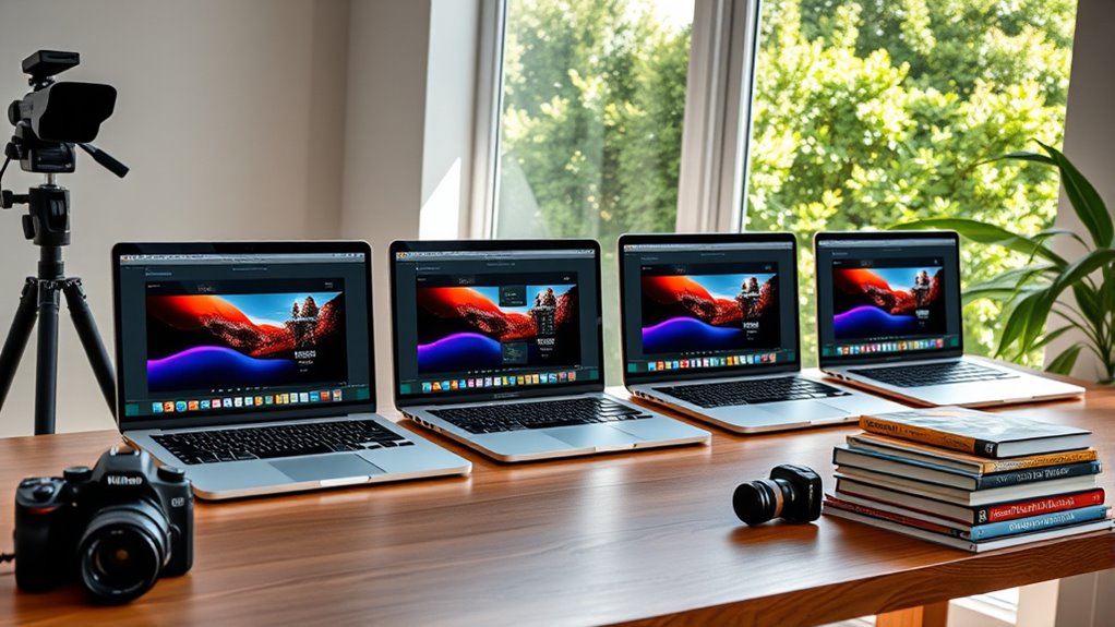If you’re looking for the best MacBook Pros for photography and Lightroom in 2025, I recommend models with the latest M4 Max chip, a stunning Liquid Retina XDR display, and ample RAM like 36GB or more for smooth multitasking. Storage is essential, so go for at least 1TB SSD, and long battery life helps during on-the-go editing. Stick with the latest tech, and you’ll get seamless performance. Keep going, and you’ll find even more details to optimize your choice.
