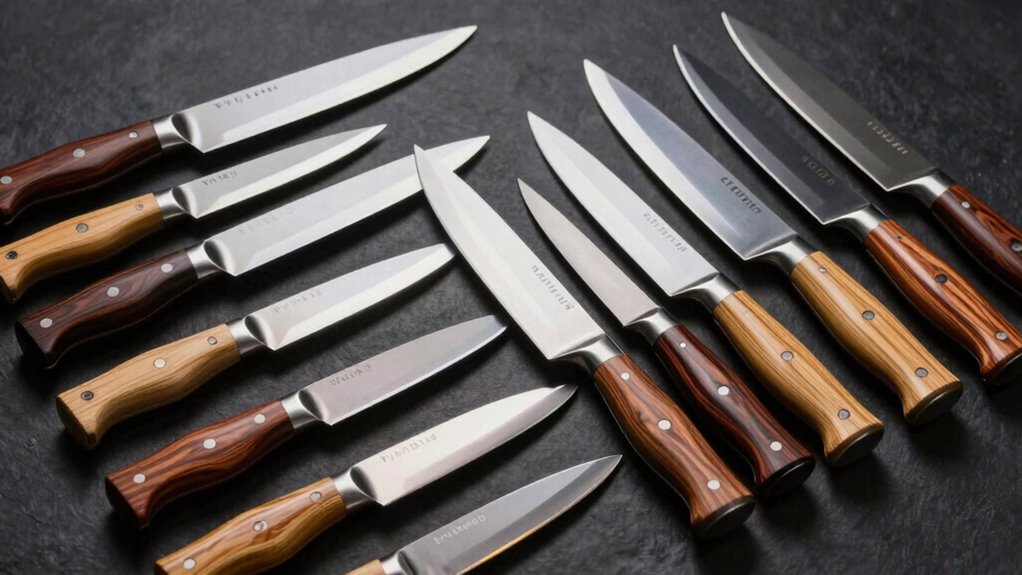 Think of the handle as the loyal handshake between you and your knife. For durability, I recommend full-tang handles made from materials like pakkawood or G-10. These are tough, resistant to moisture, and withstand daily use without cracking or warping. I’ve found they symbolize strength and reliability, making your kitchen adventures smoother. Selecting these materials guarantees your nakiri remains a trusted companion for years to come.