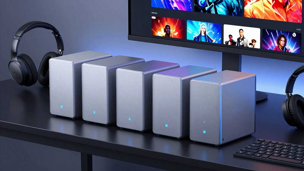 Ever wondered why some media servers handle multiple streams seamlessly while others stutter? It all comes down to processor performance. A strong CPU ensures smooth multitasking and efficient media transcoding, especially when streaming 4K videos. Multi-core processors, like quad-core or higher, boost performance by better managing large files and running demanding media server apps. The CPU’s clock speed also matters—it determines how quickly the NAS can transcode videos in real-time without lag. Additionally, processors with hardware acceleration for video decoding and encoding markedly enhance streaming performance. A high-performance CPU reduces data bottlenecks, resulting in faster file transfers and more responsive media management. When choosing a NAS for media serving, prioritizing processor power ensures your device can handle multiple streams and complex tasks effortlessly.