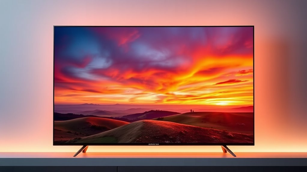 Display technology type substantially impacts your viewing experience, especially with OLED TVs offering distinct advantages over other options. OLEDs use self-lit pixels that can turn on and off individually, delivering perfect black levels and high contrast ratios that bring images to life. They support HDR formats like Dolby Vision, HDR10, and HLG, which enhance color accuracy and dynamic range for a more cinematic look. Wide viewing angles are another benefit, with minimal color shift or contrast loss when watching from different positions. While brightness levels are generally lower than Mini-LED or QLED models, they’re still sufficient for most environments, especially with advanced processing. Overall, the contrast, color fidelity, and deep blacks make OLEDs a top choice for viewers seeking high-quality, immersive visuals.