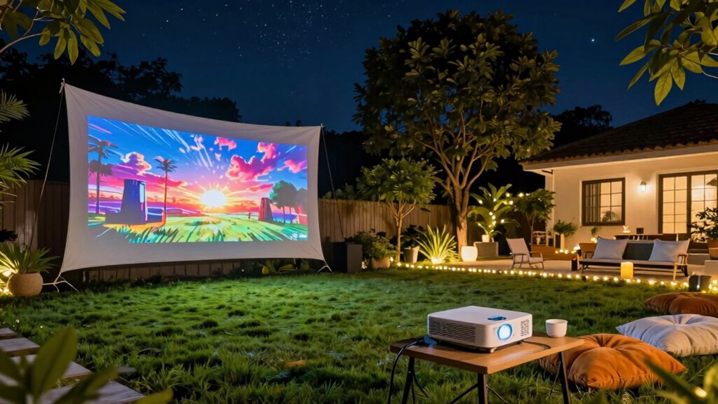 When it comes to outdoor movie nights, portability and easy setup can make or break the experience. A lightweight projector, ideally under 10 pounds, makes carrying and positioning much simpler. Quick, tool-free setup features like foldable screens and adjustable stands save time and effort, letting you focus on enjoying the show. A compact design with a carrying case or bag adds to convenience, making transportation hassle-free. Wireless options like WiFi and Bluetooth eliminate tangled cables, speeding up the setup process. Built-in features such as automatic focus and keystone correction help you quickly align the image and ensure clarity with minimal manual adjustments. Overall, choosing a projector that’s easy to move and set up means more fun and less frustration during your backyard movie nights.