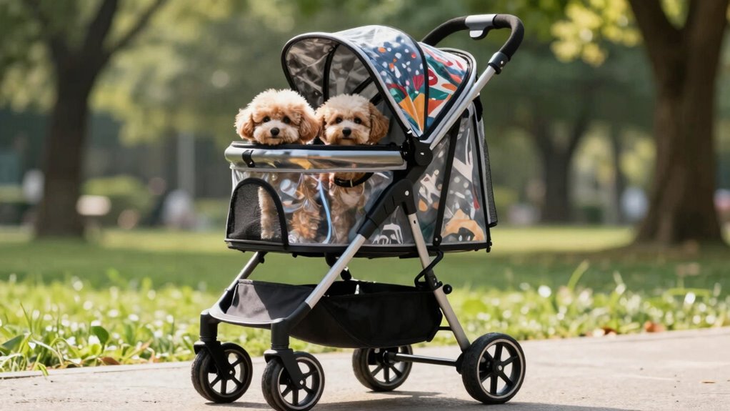 When choosing a pet stroller for two small dogs, it’s important to contemplate the storage options to keep your essentials organized and easily accessible. I look for a spacious, adjustable storage basket underneath the stroller to carry pet supplies and personal items. Side pockets or additional compartments are a plus, making it easy to grab water bottles, treats, or wipes during outings. I also prioritize weather-resistant and secure storage to protect belongings from rain, dust, or dirt. Built-in cup holders or drink holders are convenient for keeping beverages close at hand. Quick-access zippers or easy-open compartments are essential for retrieving supplies quickly without disturbing my dogs. Good storage options enhance convenience and ensure a smooth, enjoyable walk for both my pets and me.