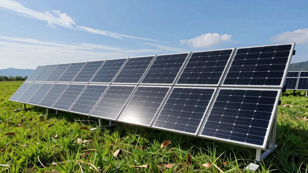 Think of cloudy days as a gentle nudge to get creative. To maximize efficiency, I position my panels at the ideal angle to catch the limited sunlight and keep them clean to prevent dust from blocking rays. Using a charge controller helps manage power flow, ensuring I make the most of low sunlight. Even in gray skies, smart adjustments can keep my system humming like a well-tuned instrument.