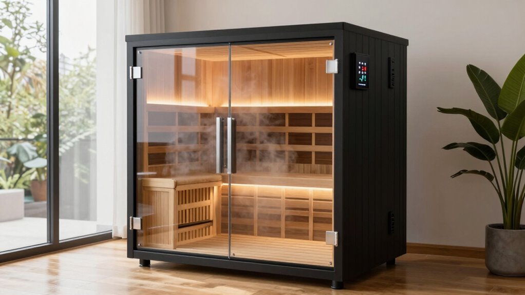 Choosing a portable steam sauna with the right heating power is essential for quick, effective sessions. Saunas equipped with higher wattage generators, like 1200W or 1500W, heat up faster and deliver more consistent steam. This means you can reach your desired temperature in as little as five minutes, rather than waiting 15 minutes or more. Many models include adjustable heating levels, allowing you to customize temperature and steam intensity for a personalized experience. Rapid preheating capabilities are usually linked to higher power output, reducing wait time and making your sauna sessions more efficient. The combination of sufficient wattage and adjustable settings guarantees even heat distribution, so you get the most out of each session without unnecessary delays or uneven heating.