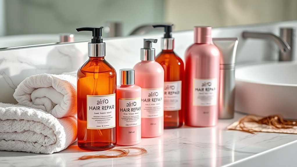 Choosing the right product for dry, damaged hair depends heavily on matching its formulation to your specific hair type. If you have curly, straight, or wavy hair, look for products designed for your texture to guarantee better manageability and repair. If your hair is chemically processed or color-treated, select formulas that are gentle and specifically formulated to avoid further damage. For added hydration, opt for moisturizers or masks made for dry or damaged hair that penetrate deeply. Ingredients like keratin, collagen, or argan oil are excellent choices since they target damage relevant to your hair type. Also, consider your hair’s porosity to improve absorption and effectiveness. Matching these factors helps guarantee your hair receives the tailored care it needs for ideal repair.