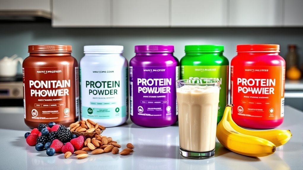 Since many protein powders are fortified with vitamins and minerals, they can enhance your overall nutrition and support a balanced, calorie-controlled weight loss plan. Some formulations include added fiber, which promotes satiety and helps curb appetite, making it easier to stick to your calorie goals. Low-calorie options with high protein content help preserve muscle mass while shedding fat. Additionally, products with natural or added antioxidants can reduce oxidative stress caused by weight loss efforts. Choosing powders with minimal added sugars and artificial ingredients also benefits weight management by avoiding unnecessary calorie intake. These nutritional benefits not only support your weight loss journey but also contribute to overall health, ensuring you’re nourishing your body while achieving your fat-burning goals.