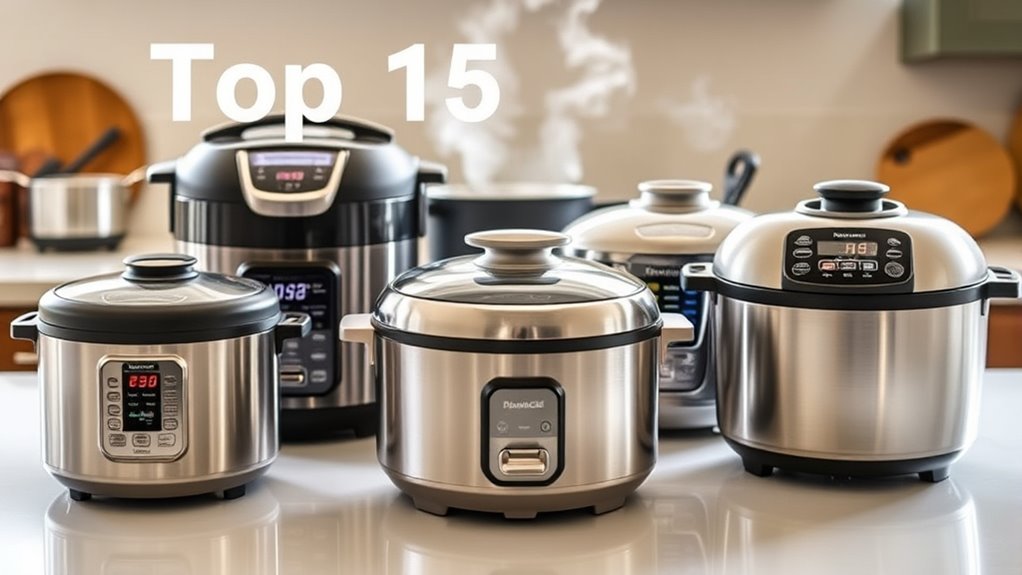 If you’re looking for the 15 best rice cookers of 2025 to get perfectly fluffy rice, I’ve got you covered. I’ve explored models like the Aroma digital cooker, Zojirushi Neuro Fuzzy, and COSORI’s 10-cup version, all offering advanced technology, multi-functionality, and user-friendly designs. These cookers are suitable for small to large households and come with features like steaming, slow cooking, and keep warm. Keep exploring to find the perfect fit for your rice cravings.