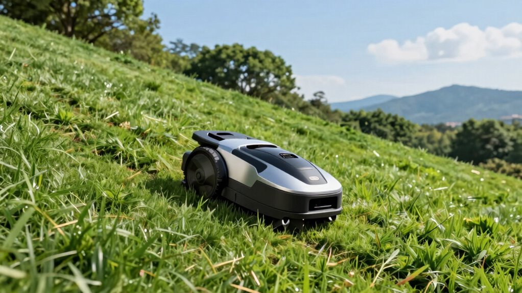 Have you ever wondered how some robotic lawn mowers conquer steep slopes with ease? It all comes down to traction and grip. A mower designed for steep inclines typically features a track-based drive system, which offers better traction and reduces slippage. High-traction tires or omni-wheels adapt to uneven terrain, ensuring stability and consistent contact with the ground. Proper weight distribution and a low center of gravity are essential, helping the mower maintain grip without tipping. Additionally, adaptive suspension or traction control systems adjust to changing terrain, providing extra stability on challenging slopes. With these features, the mower can safely ascend slopes of 45° or more, preventing slips and ensuring efficient, reliable operation even on the steepest lawns.