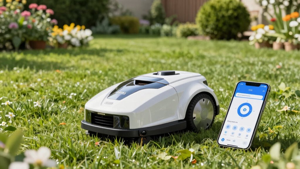 Ensuring safety and obstacle avoidance in a robotic lawn mower is essential, especially with app control features that allow remote operation. Advanced obstacle detection systems, like AI vision sensors or 3D perception, help identify and avoid objects safely. Safety features such as bumper sensors and collision avoidance technology are vital for preventing accidents around pets, kids, and furniture. Mowers with obstacle recognition can differentiate between grass, pets, and obstacles, reducing damage and injuries. Weather-resistant safety sensors guarantee secure operation during rain or bad weather, preventing slips. An effective obstacle avoidance system keeps the mower moving efficiently, minimizing stops and rerouting. Overall, these features promote safer, more reliable lawn maintenance, giving you peace of mind while your mower handles the chores.