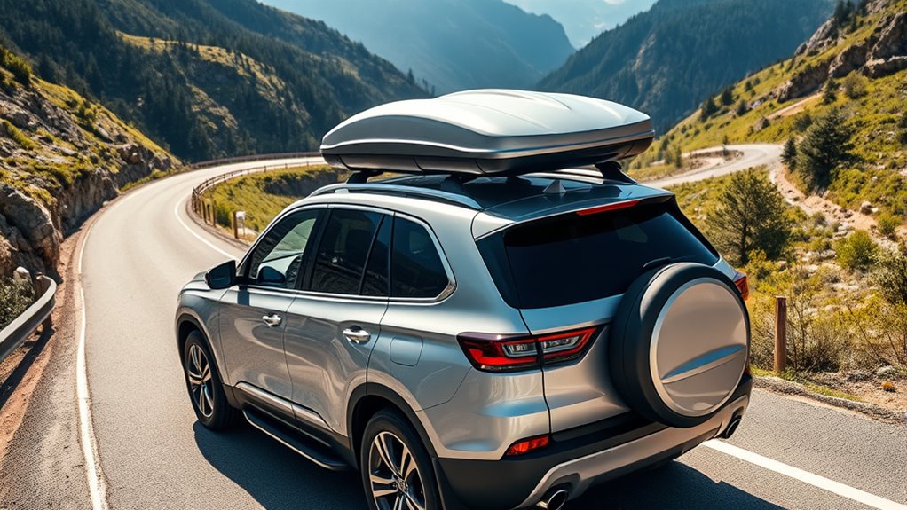 When it comes to finding the right roof cargo box, guaranteeing compatibility with your vehicle’s roof setup is essential. First, check if your car has roof racks, crossbars, or side rails, or if the cargo box can mount directly without racks. Measure the maximum crossbar width the box can handle to ensure a proper fit. Also, verify that the mounting system—straps, hooks, or U-bolts—is suitable for your roof type, providing a secure attachment. Consider your vehicle’s size, roof height, and any clearance restrictions to avoid fitting issues. Finally, review manufacturer guidelines to confirm the cargo box is compatible with your specific vehicle model, whether it’s a car, truck, SUV, or minivan. Compatibility ensures safe, hassle-free use.