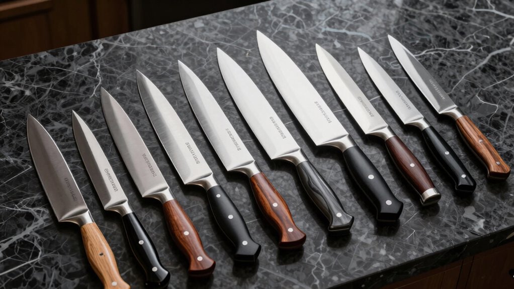 If you’re exploring the 15 best santoku versus chef knife sets in 2026, I’ve found that top options include handcrafted Damascus sets, VG-10 steel cores, and ergonomic handles for comfort. These sets vary from artisanal 3-piece kits to extensive collections with accessories, perfect for different skill levels and needs. I’ll guide you through factors like blade design, durability, and cost, so you can choose wisely—keep going to discover the essentials that will elevate your culinary game.