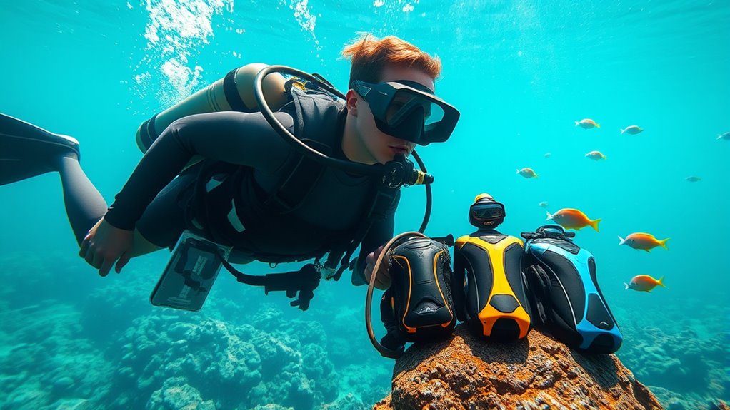When evaluating scuba diving sets, ease of use plays a vital role in making sure your experience is smooth and enjoyable. A simple, intuitive setup with minimal components reduces errors and boosts confidence, especially for beginners. Features like quick-release buckles, adjustable straps, and easy-to-read gauges make donning, adjusting, and monitoring gear effortless underwater. Lightweight and ergonomic designs help minimize fatigue, so you can focus on exploring rather than managing bulky equipment. Clear instructions and straightforward maintenance procedures ensure you can operate and care for the gear without extensive technical knowledge. Integrated features such as automatic inflators, dry-top snorkels, and intuitive controls streamline the process, making underwater navigation more comfortable and less complicated. This focus on ease of use enhances safety and overall diving enjoyment.