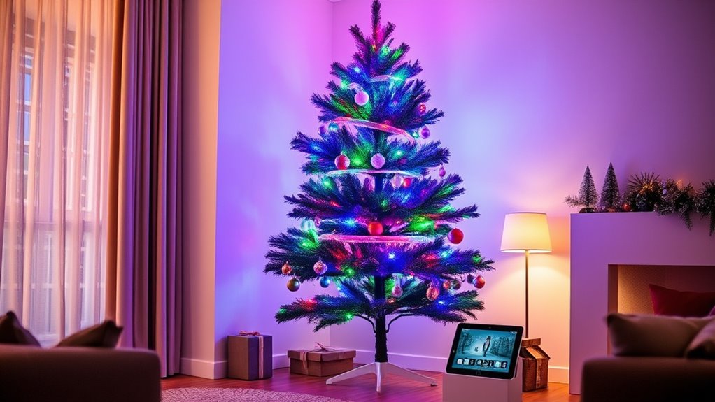 Like a guardian angel, smart Christmas trees come equipped with safety features to protect your holiday. They often include automatic shut-off timers, overheat protection, and sturdy built-in stands to prevent tipping. Many models also have child safety locks and surge protection. These features give me peace of mind, letting me enjoy the festivities without worrying about fire hazards or accidents, ensuring a joyful, stress-free holiday season.