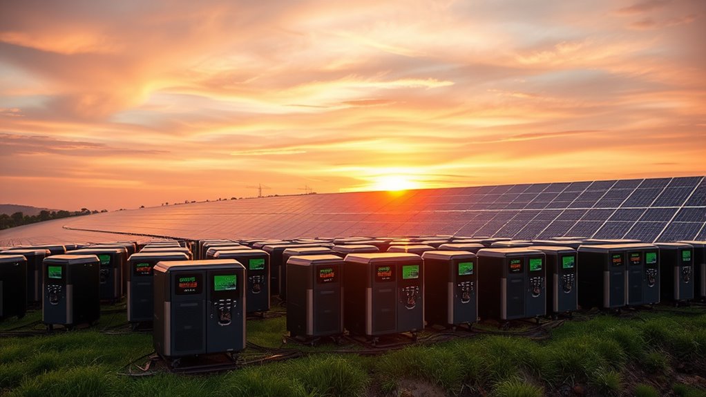 To keep my solar generator running smoothly long-term, I regularly check and clean the solar panels to guarantee maximum efficiency. I also inspect cables and connections for wear and tear, and keep the unit in a cool, dry place when not in use. Additionally, I follow the manufacturer’s guidelines for battery maintenance, like avoiding over-discharging and periodically charging it fully to prolong its lifespan.