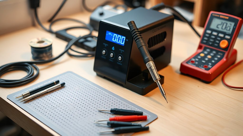 Imagine safety features as the shield guarding your craftsmanship. Modern soldering stations should have automatic shut-off to prevent overheating, heat-resistant covers to protect against accidental burns, and reliable grounding to prevent electrical shocks. These elements act like a trusted guardian, allowing me to focus on precision without worry. When safety is built-in, soldering becomes a confident dance rather than a risky chore.