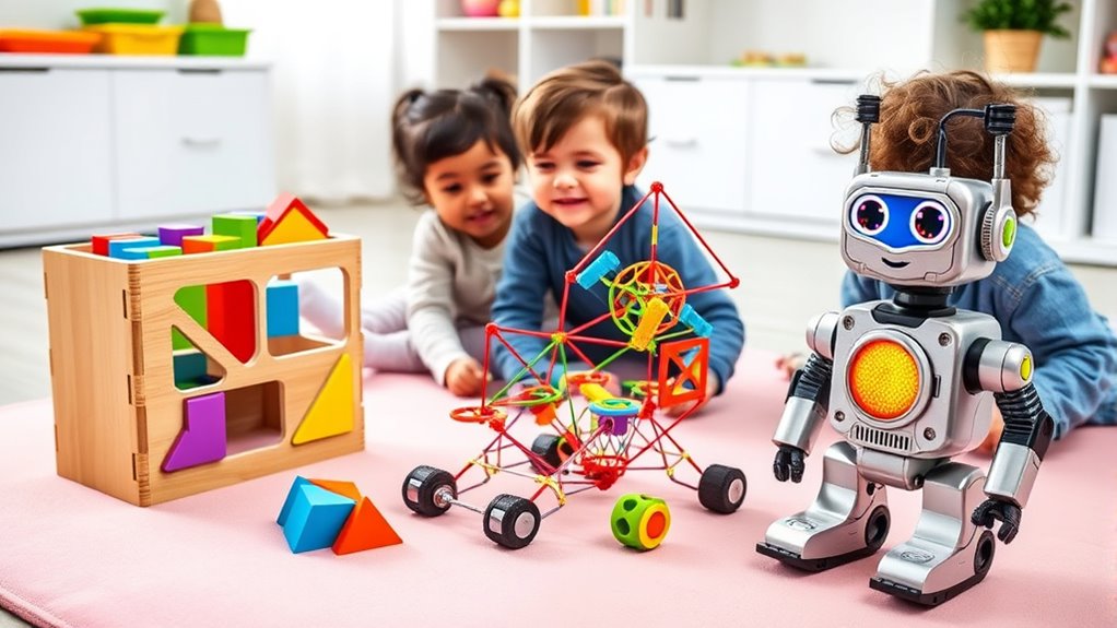 After confirming that a STEM toy meets safety standards, I focus on its educational value to make certain it truly benefits my toddler’s development. I look for toys that encourage problem-solving and critical thinking through open-ended play and challenging activities. It’s important that the toys introduce basic concepts in science, technology, engineering, and math suited to my child’s age. I also check that they offer guided activities or design features that foster curiosity and early STEM understanding. Additionally, I prioritize toys made from durable, non-toxic materials that can withstand long-term use. Sensory engagement and hands-on manipulation are vital, as they help develop fine motor skills and spatial awareness. Overall, a toy’s educational value ensures my child learns while having fun.