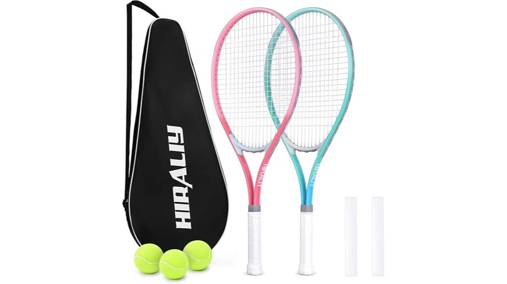 If you’re seeking an affordable, beginner-friendly set to kickstart your tennis journey, the HIRALIY 27 Tennis Rackets Set is an excellent choice. It includes two pre-strung lightweight racquets, perfect for casual play or training, with a comfortable grip that reduces fatigue. The set also comes with three balls, two overgrips, and four carry bags, making it ideal for two players or practice sessions. Built from durable, water-resistant aluminum, these rackets offer stability and longevity. Overall, the set provides good value for beginners and recreational players, though some accessories like the bag straps and grip tape may need careful handling over time.