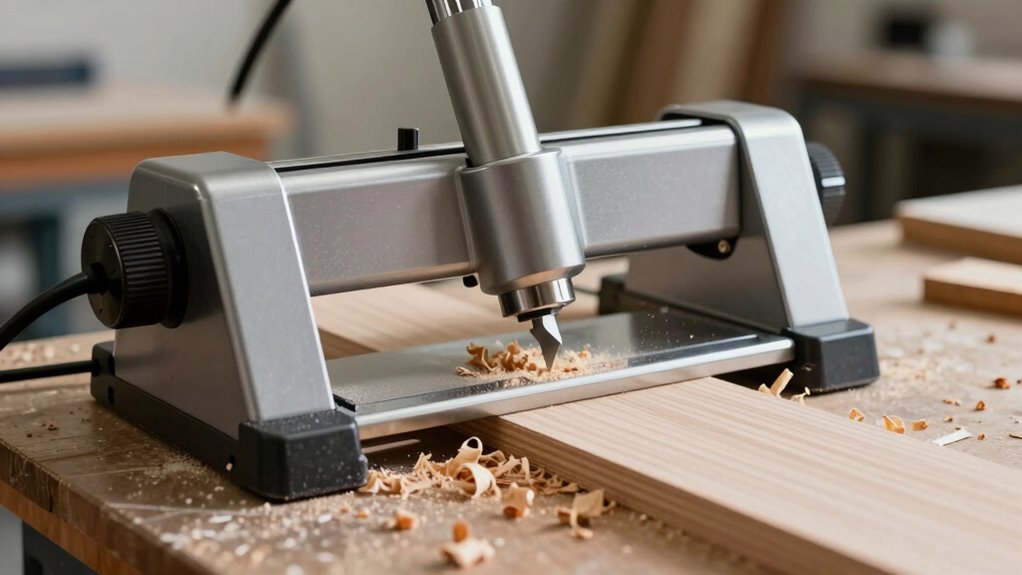 A sturdy build is essential for ensuring your thickness planer delivers accurate and consistent results. A cast iron or aluminum bed helps maintain flatness and reduces vibrations, which is pivotal for precision. Four-post or multi-column designs provide added stability, supporting consistent cuts even with larger or longer boards. High-quality cutter heads made with durable blades or inserts prevent wobbling and produce a smooth finish. A well-constructed frame minimizes snipe and unwanted movement, ensuring accurate thickness adjustments. Reinforced support structures and heavy-duty materials boost overall stability, especially when working with demanding projects. When the build quality is solid, your planer becomes more reliable, with fewer issues and better results. Investing in a well-built machine pays off in cleaner, more precise woodworking.