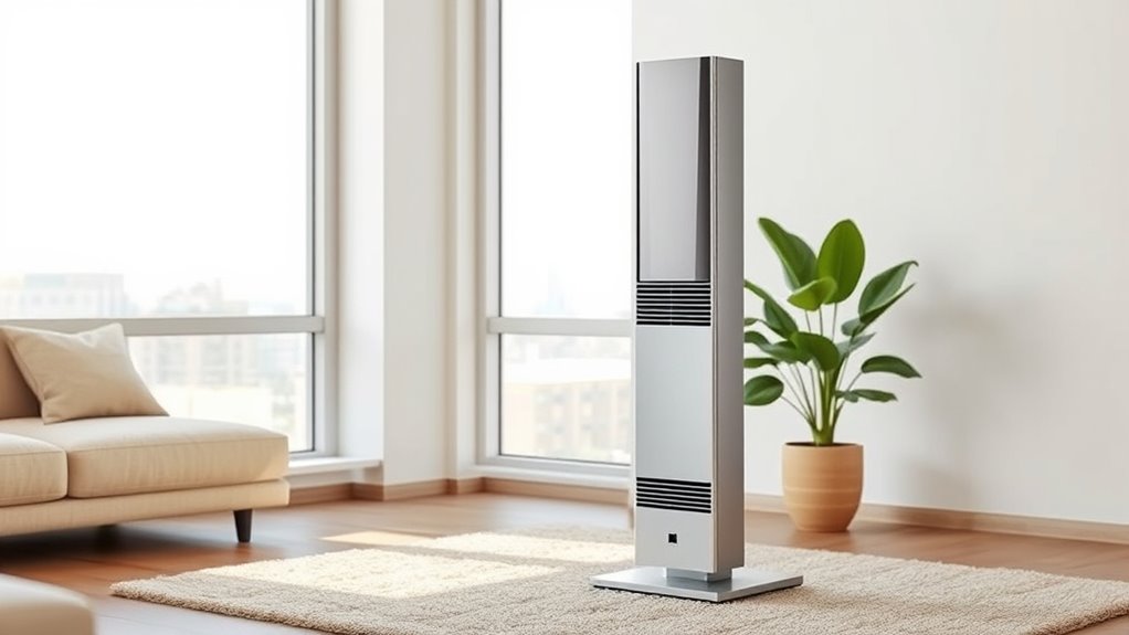 Designed for those who prioritize quiet, maintenance-free air purification, the Ionic Pro Turbo Air Purifier Tower stands out as the top choice in 2025. It effectively removes 99.9% of airborne irritants like dust, pollen, pet dander, smoke, and odors, covering up to 500 sq. ft. with three purification cycles per hour. Its advanced ionic technology operates silently without fans or motors, making it perfect for bedrooms and quiet spaces. Maintenance is simple—just wipe the blades clean—saving costs on filters. Plus, it’s ultra-energy efficient, consuming only 12W, so you get continuous clean air without high electricity bills.