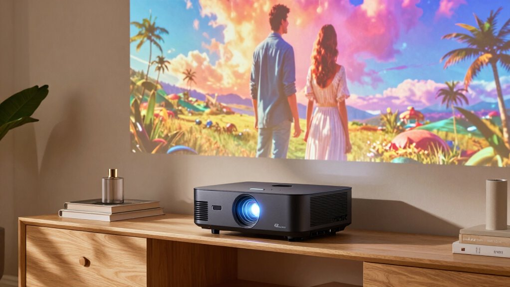 Think of a laser projector’s light source as the heart of its brilliance—steady and enduring. Typically, laser projector lamps last between 20,000 to 30,000 hours, which is like watching your favorite movie daily for over a decade without replacing the heart. This longevity means less maintenance and more time enjoying vibrant, sharp images. So, when you invest in a laser projector, you’re truly investing in long-lasting, radiant performance.