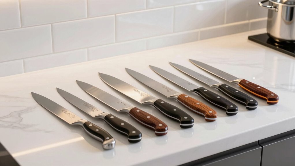 Have you ever wondered how to get the best value when shopping for kitchen knives? Price and warranty play pivotal roles. Usually, higher-priced knives use better materials, craftsmanship, and stay sharp longer, offering more durability. Many premium knives come with lifetime warranties, reflecting confidence in their quality and performance. These warranties often cover sharpening, replacements, or repairs, giving you peace of mind. On the other hand, budget-friendly options might lack extensive warranties, which could mean higher costs for maintenance or replacements down the line. When comparing value, it’s vital to look beyond the initial price. Consider the warranty coverage—its duration and what it includes—to guarantee you’re making a smart, long-term investment in your kitchen tools.