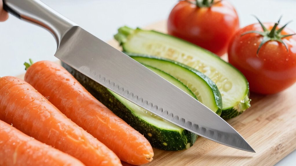 The longevity of a vegetable knife’s sharpness depends heavily on the quality of its steel and how it’s manufactured. High-carbon stainless steel blades tend to keep their edges longer because they’re harder and more durable than lower-grade steels. Proper sharpening and honing techniques, along with regular maintenance, also play a pivotal role in maintaining sharpness over time. The blade’s edge angle influences how well it retains its sharpness; a narrower angle, around 15°, delivers a sharper cut but may need more frequent touch-ups. Coatings or treatments, like non-stick or anti-rust layers, can impact edge retention—they may protect the blade or, in some cases, slightly diminish its ability to hold an edge. Choosing the right steel and manufacturing process is key to lasting sharpness.