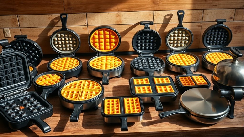 If you’re looking for the best waffle irons to enjoy perfect, crispy breakfasts every morning, I recommend options like compact mini makers for quick singles or advanced Belgian models with rotating features for restaurant-quality results. Larger appliances with adjustable controls and multiple waffles suit families, while easy-clean, safety-focused designs make your mornings smoother. Keep in mind your space and cooking needs. Explore further to discover which waffle iron matches your style and breakfast routine perfectly.
