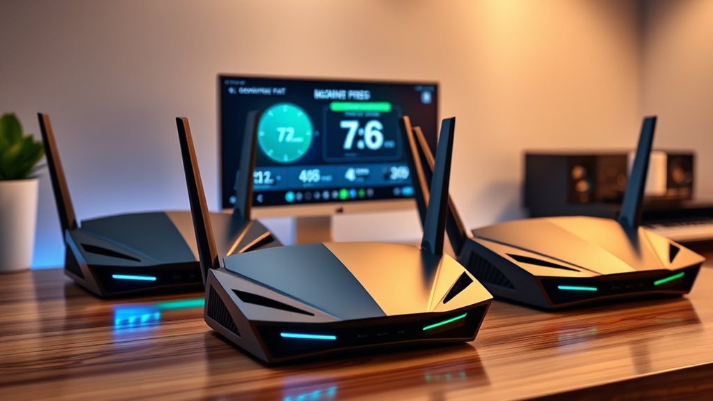 If you’re looking for the fastest and most reliable WiFi 7 routers of 2025, I recommend checking out models like TP-Link Archer BE550, ASUS RT-BE86U, NETGEAR RS280S, and Amazon eero 7. These routers support multi-gigabit speeds up to 3.6 Gbps or higher, extensive coverage, and many device connections. They also include advanced features like Multi-Link Operation, multiple antennas, and mesh compatibility. Keep exploring further to see how each one can meet your needs.