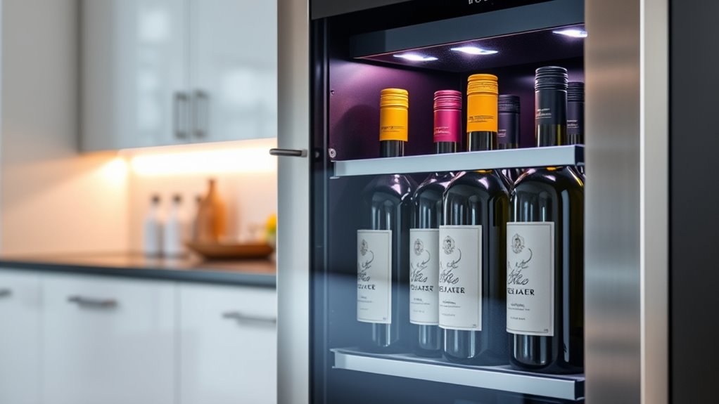 Selecting the right temperature zone options is essential for maintaining your wine’s quality and versatility. Wine coolers typically come with single or dual zones, allowing for different storage conditions. Dual-zone units offer precise control, with upper and lower zones set at different temperatures—perfect for aging reds and chilling whites simultaneously. This flexibility helps preserve wine integrity and enhances serving options. Single-zone coolers maintain a uniform temperature, simplifying management but limiting versatility for different wine types. Some models feature adjustable zones, letting you customize temperature ranges within specific limits. Your choice affects storage quality: dual zones provide ideal conditions for aging and serving various wines at once. Picking the right zone setup ensures your collection stays in top shape and ready to enjoy.