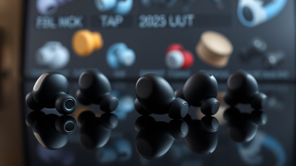Choosing wireless earbuds with intuitive controls can considerably enhance your overall experience, especially during active use. Look for earbuds with touch or button controls that let you manage playback, calls, and voice commands without reaching for your phone. Customizable gestures or expanded control areas improve responsiveness during workouts or multitasking. Quick access features like double-tap, triple-tap, or press-and-hold functions ensure seamless operation. It’s also important that controls work reliably in different conditions, such as when wearing gloves or during sweat and moisture exposure. Additionally, easy pairing and device switching simplify setup and augment usability, saving you time. Well-designed controls make your earbuds more functional and user-friendly, whether you’re commuting, exercising, or working.