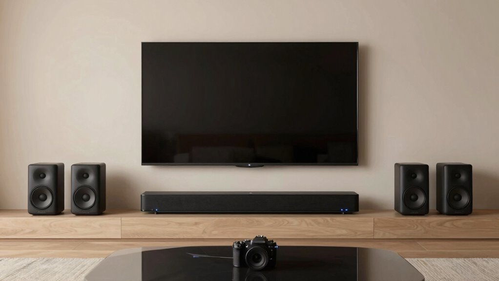 Wireless surround sound systems handle signal interference through advanced technologies like Wi-Fi, Bluetooth, and proprietary frequency bands that minimize disruptions. They often include features like adaptive channel selection and auto-fallback to stable frequencies, which help maintain a clear connection even in crowded wireless environments. I’ve found that choosing a system with these smart features guarantees a smoother, more reliable listening experience without constant interruptions.