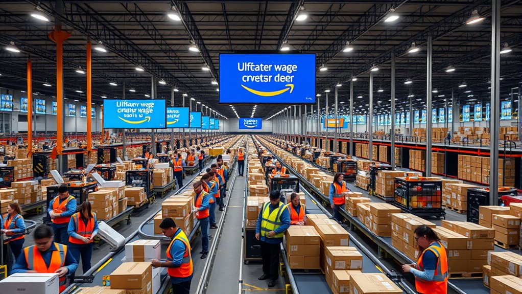 Amazon is investing $1 billion to raise wages and improve healthcare benefits for its U.S. fulfillment and transportation workers. This significant commitment aims to increase average pay to over $23 per hour, directly boosting workers’ earning potential. For those with more tenure, hourly wages will see increases between $1.10 and $1.90, rewarding experience and loyalty. Full-time employees, in particular, will benefit from an average annual pay increase of about $1,600, helping them improve their financial stability. This initiative responds to workforce pressures, labor unrest, and the need to attract and retain skilled employees in a highly competitive industry. You’ll notice that these wage enhancements are designed to make Amazon jobs more appealing, especially amid ongoing labor disputes and union activity. Additionally, this move reflects the growing importance of employee satisfaction and retention in the current labor market.